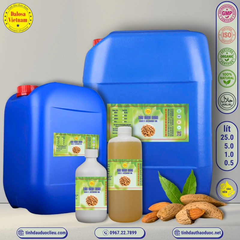 Dalosa Việt Nam cung cấp dầu hạnh nhân nguyên chất với các chứng nhận quốc tế uy tín như ISO 22000:2005, GMP, Kosher, và USDA Organic. Chúng tôi cung cấp sản phẩm với số lượng lớn cho các doanh nghiệp trong ngành dược phẩm và mỹ phẩm, đảm bảo chất lượng và độ an toàn cao cho người tiêu dùng.